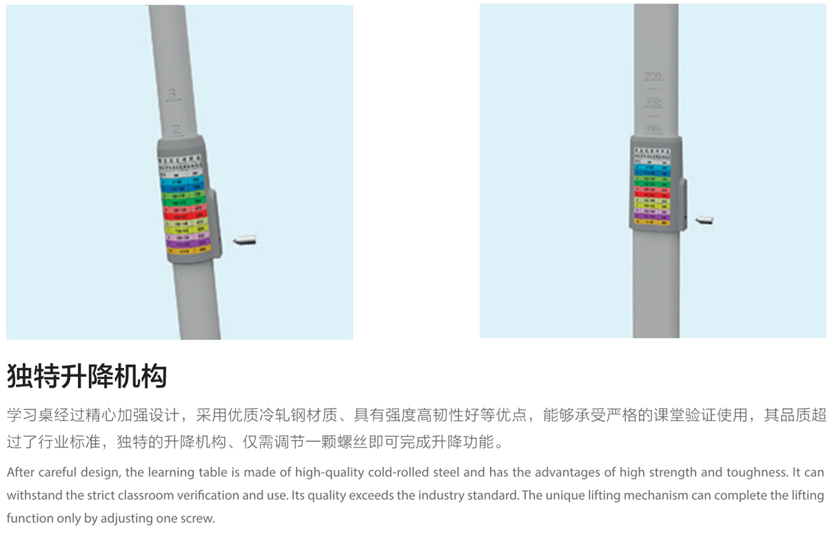 4.桌子及椅子管壁:1.5mm壁厚全旦形管、可手搖升降;