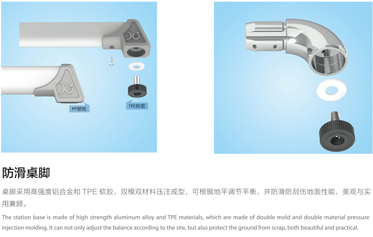 5.桌腳掌:1.5mm壁厚,腳套底有4個平衡調(diào)節(jié)機(jī)構(gòu)。