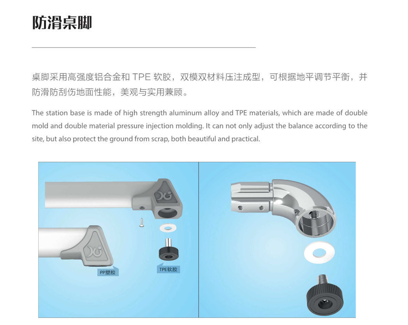 5.桌腳掌:1.5mm壁厚,腳套底有4個(gè)平衡調(diào)節(jié)機(jī)構(gòu)。